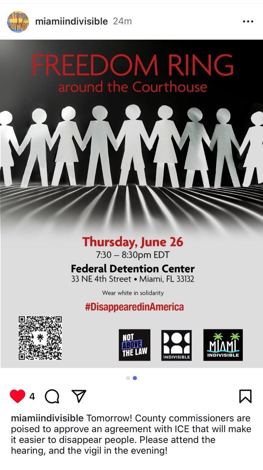RAPID RESPONSE NEEDED: It's time to make our voices heard. Miami-Dade County's Policy Committee is reviewing their contract with ICE for the County's detention of immigrants on ICE's behalf in its local jails. In exchange for just $25 per day per detainee, the proposal would allow ICE to block the county from releasing information about the immigrants it detains in county jails, meaning that those immigrants will disappear into the system without public accountability for their whereabouts. We cannot stand for this. On Thursday morning, we will be collecting and presenting public comment to voice our dissent for disappearing our neighbors. Join us to fight back against cruelty!