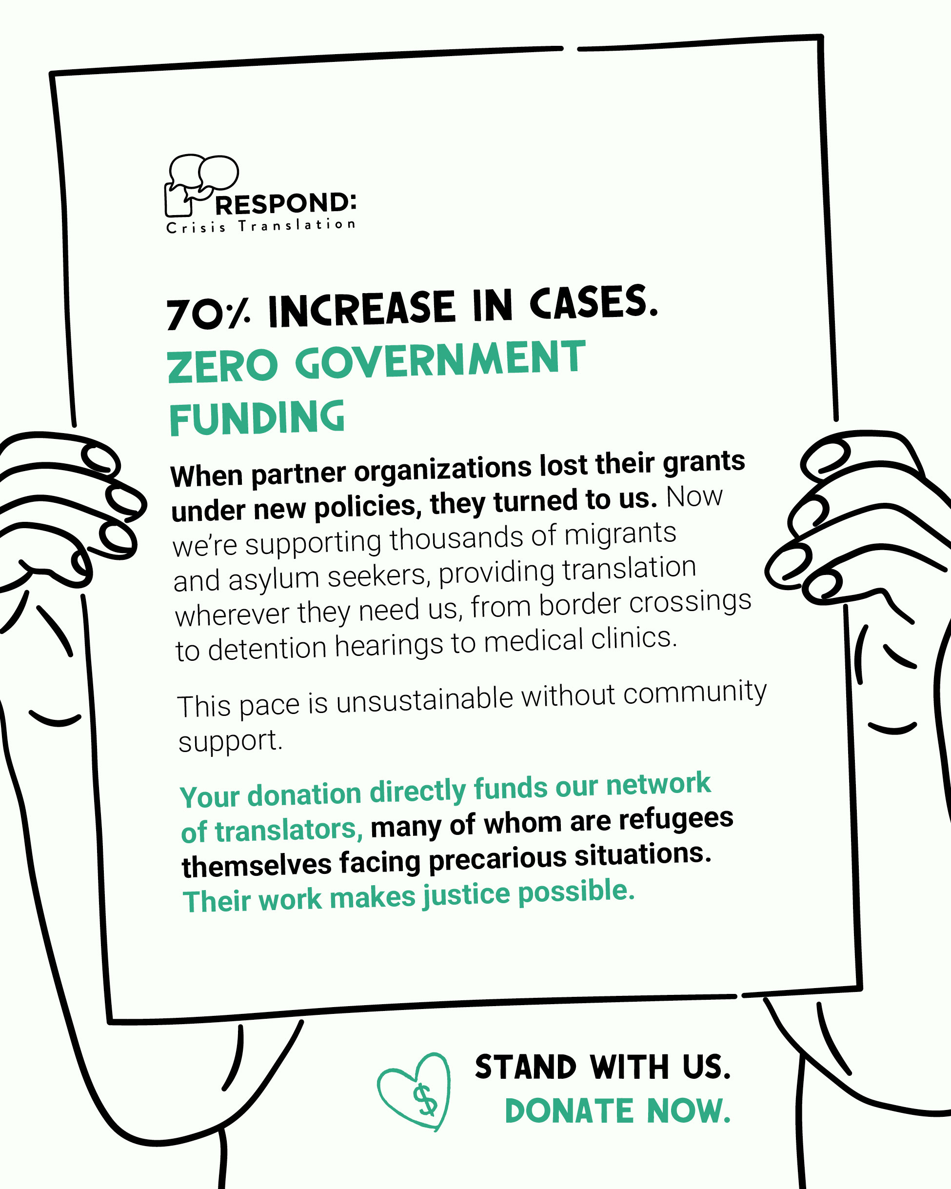 Partner organizations lost funding. We stepped in. Our translators show up wherever migrants need us, at the border, ICE raids, community clinics. Translation requests up 70% this year, all provided for free. Support this crucial justice work.